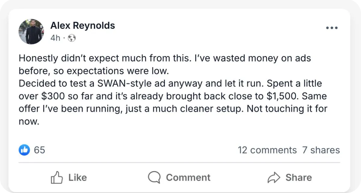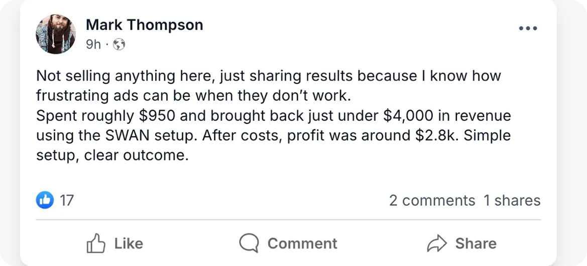 Get direct feedback, support, and scaling advice inside a private group of advertisers using the same system.
