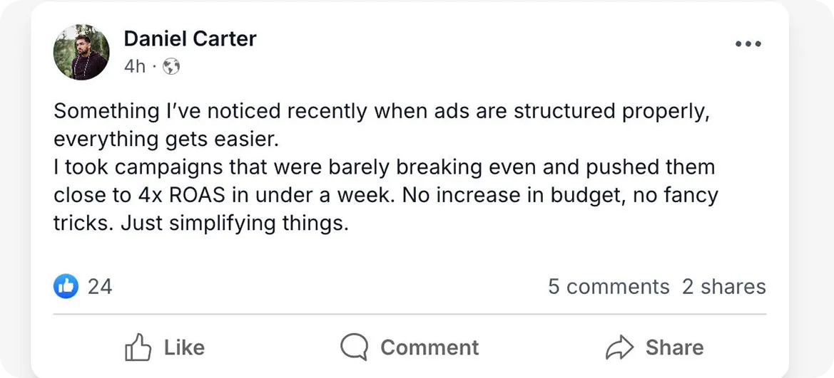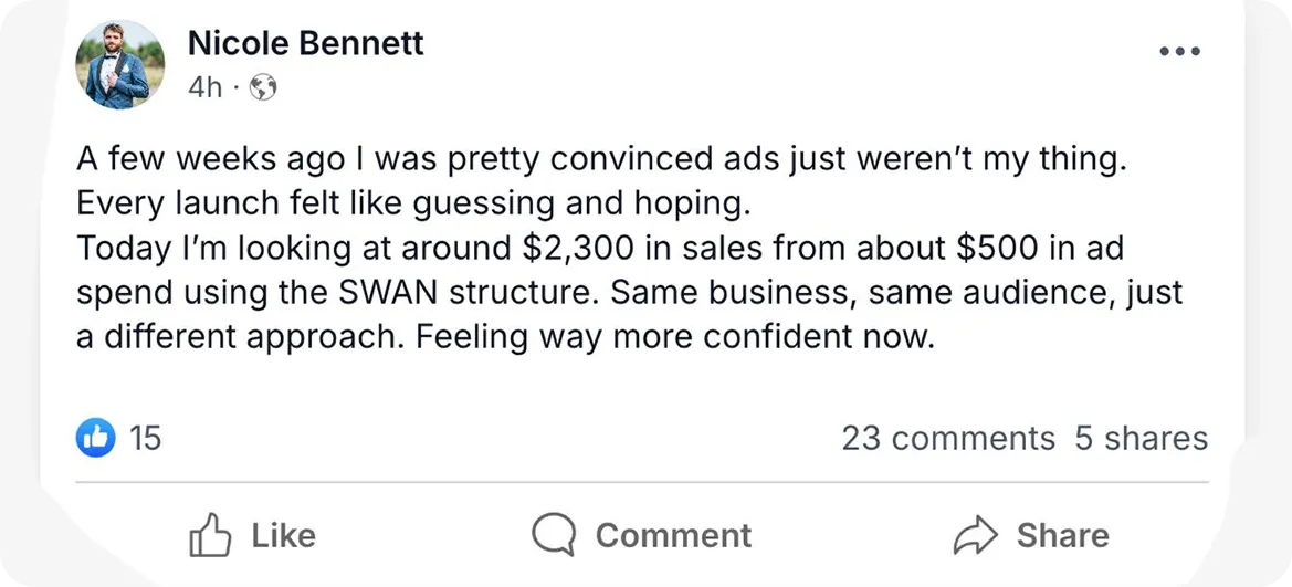 Because ads don’t fail in one place - they fail across the whole setup. This system covers messaging, structure, targeting, and follow-up, so nothing breaks between click and conversion.